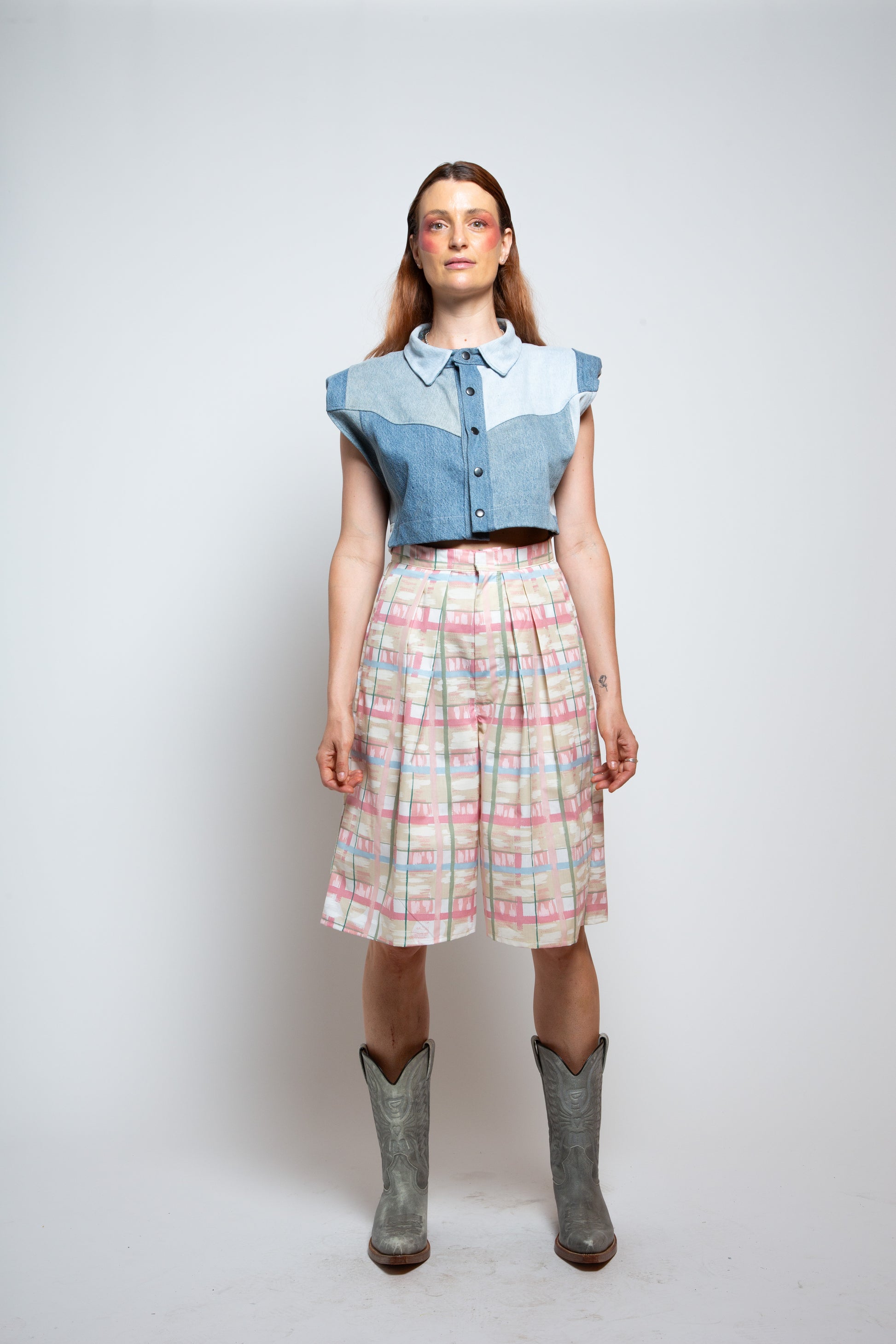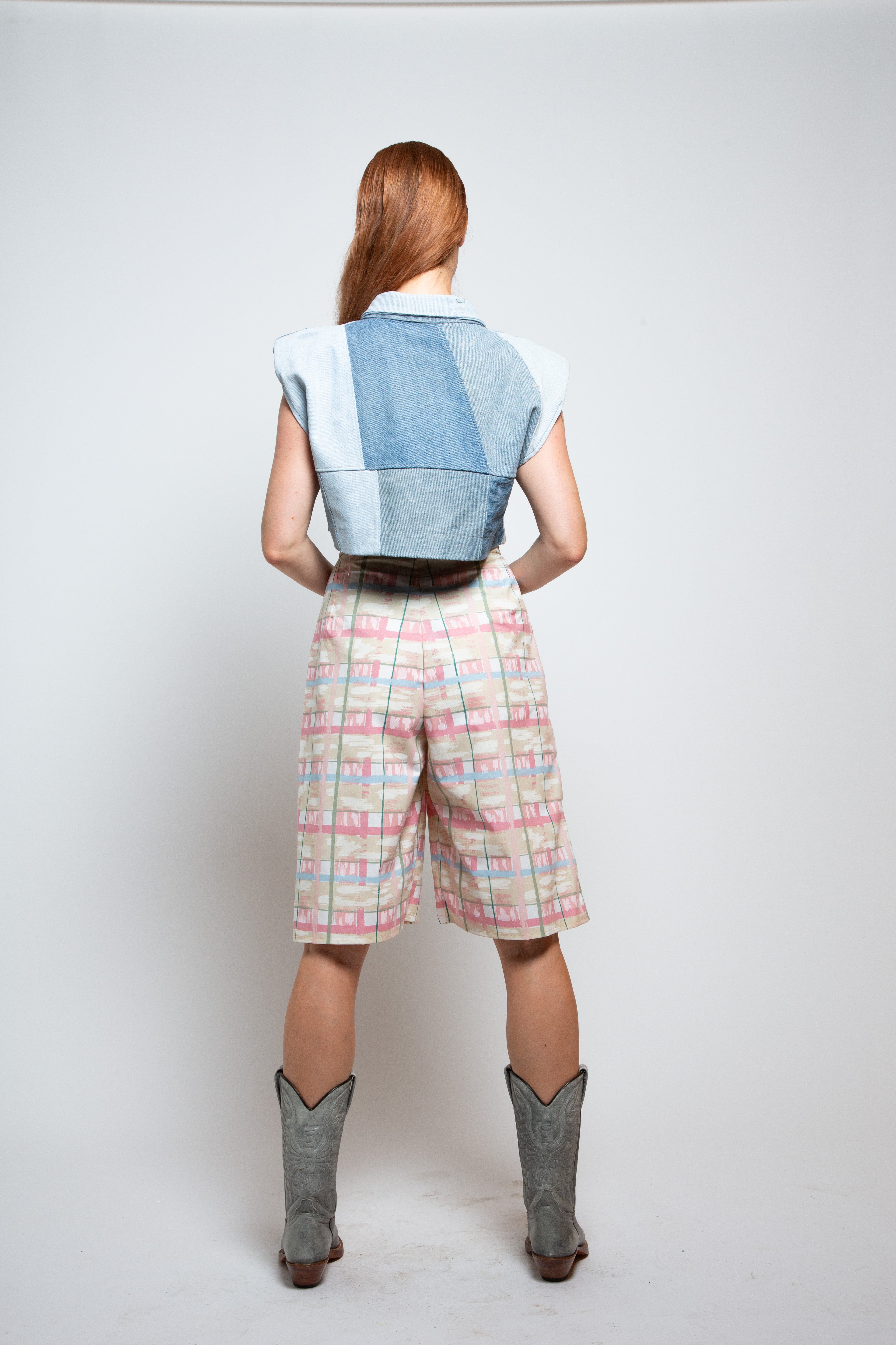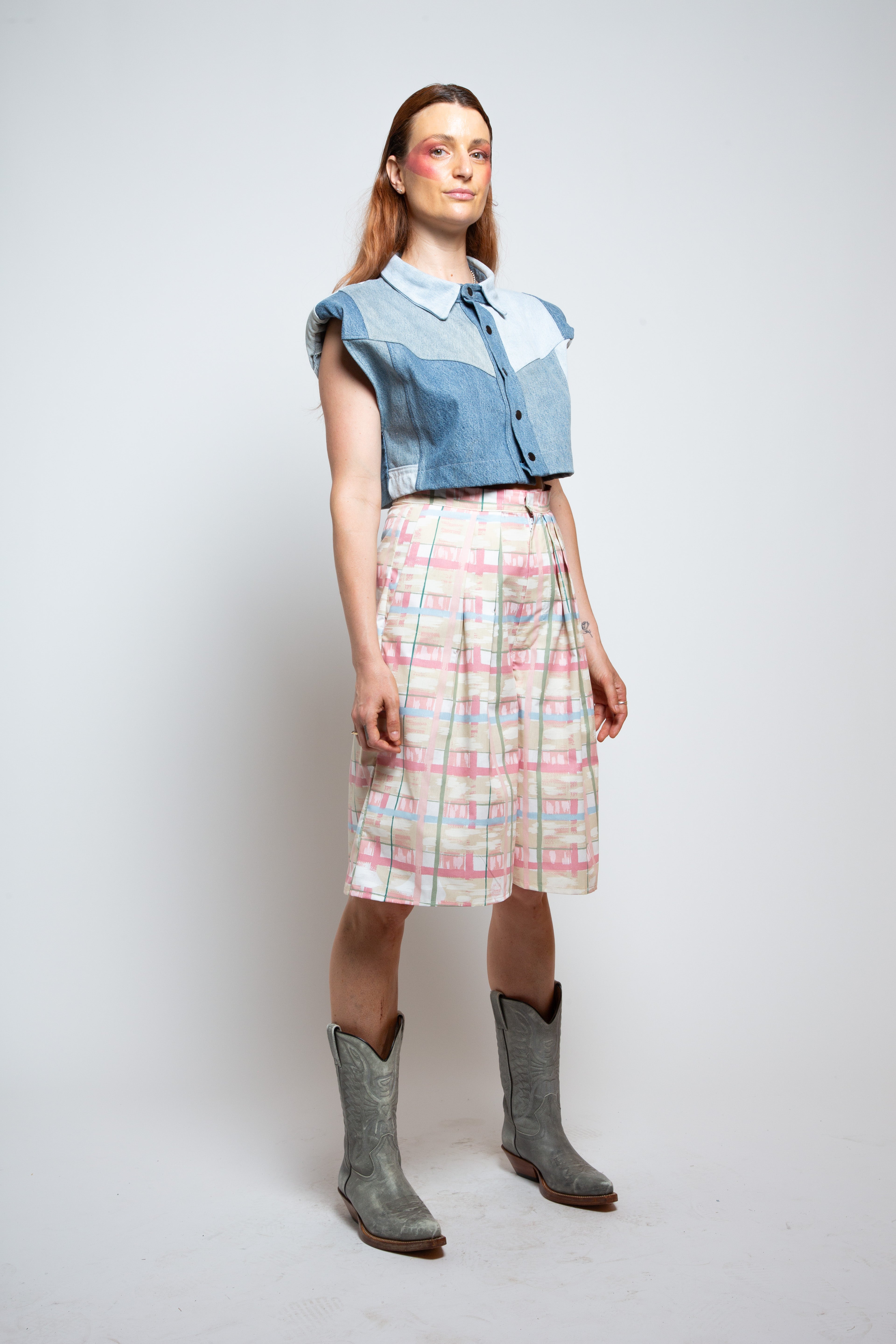 Multi-panelled upcycled denim waistcoat with shoukder pads. Metal popper fastening.