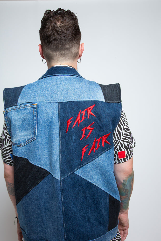 Multi-panelled upcycled denim waistcoat with shoukder pads. Metal popper fastening.