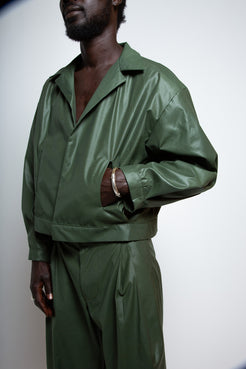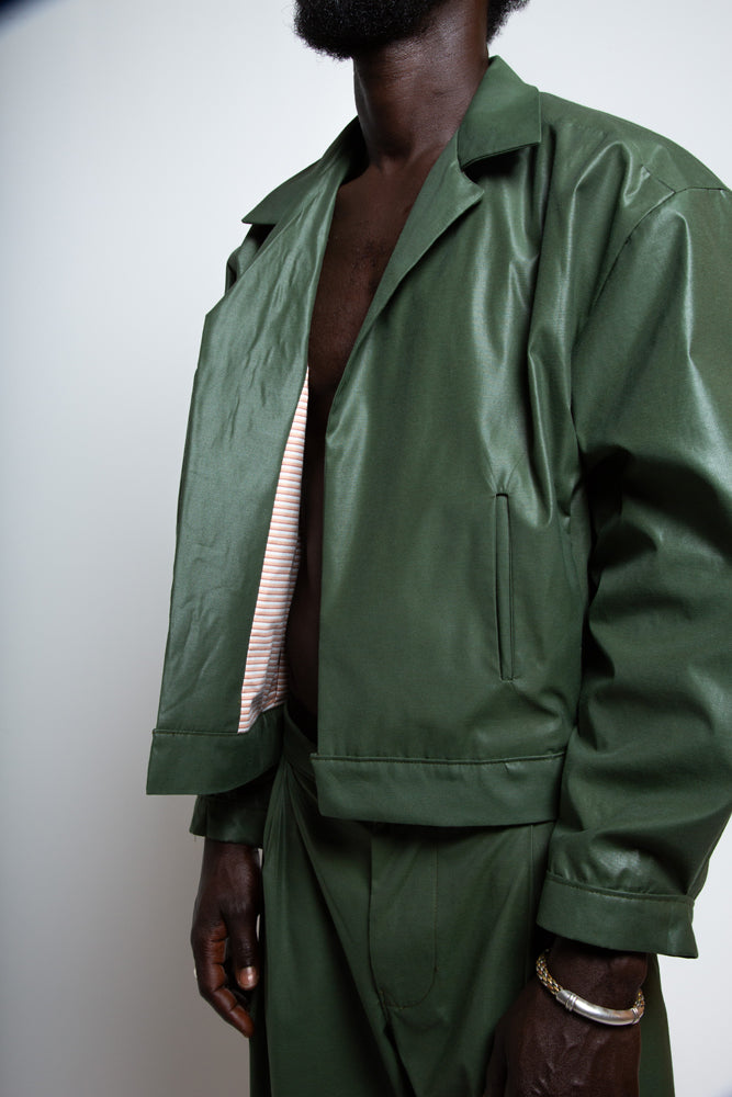 A relaxed silhouette, box style jacket with wide sleeves. Complete with popper fastening and side pockets.