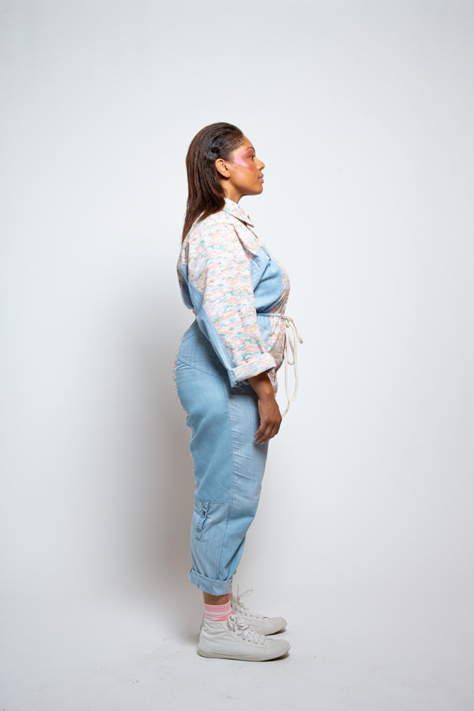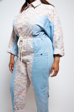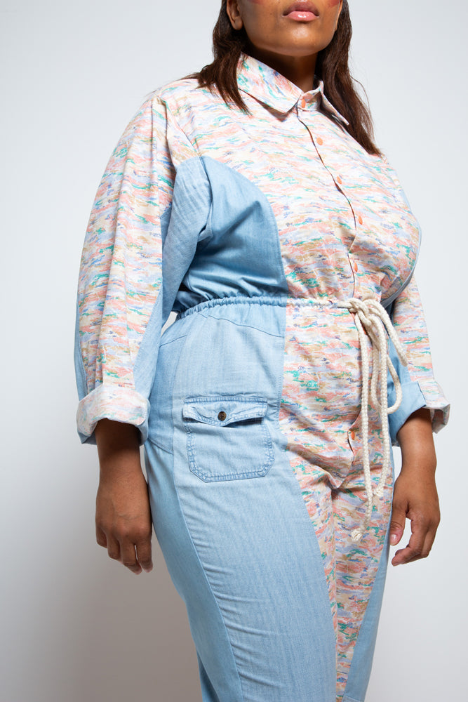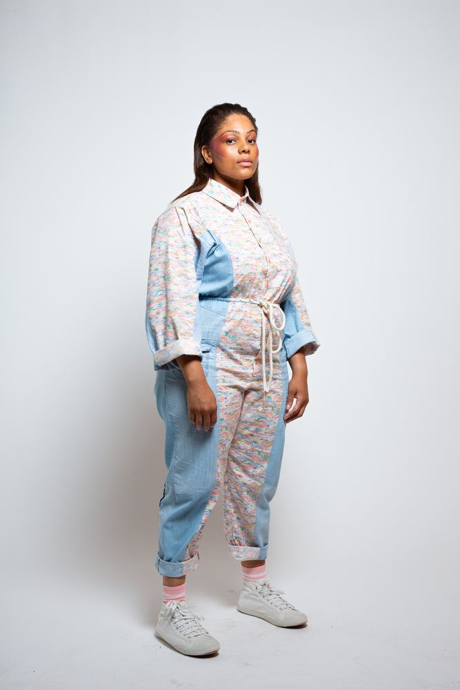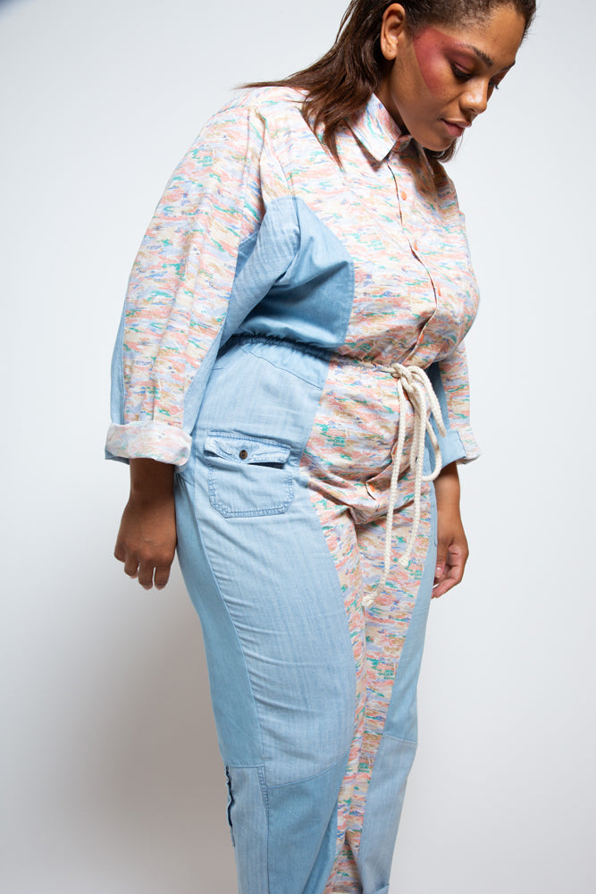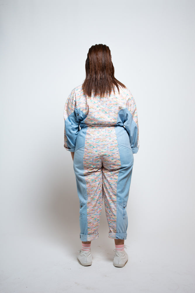 Upcycled vintage denim and 80s print panelled design with batwing style sleeves. Turn up legs that you can adjust to your desired length. Snap popper fastenings at the front and a rope drawstring....also vintage deadstock.