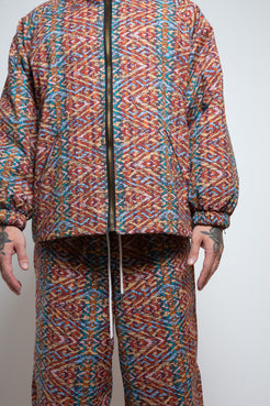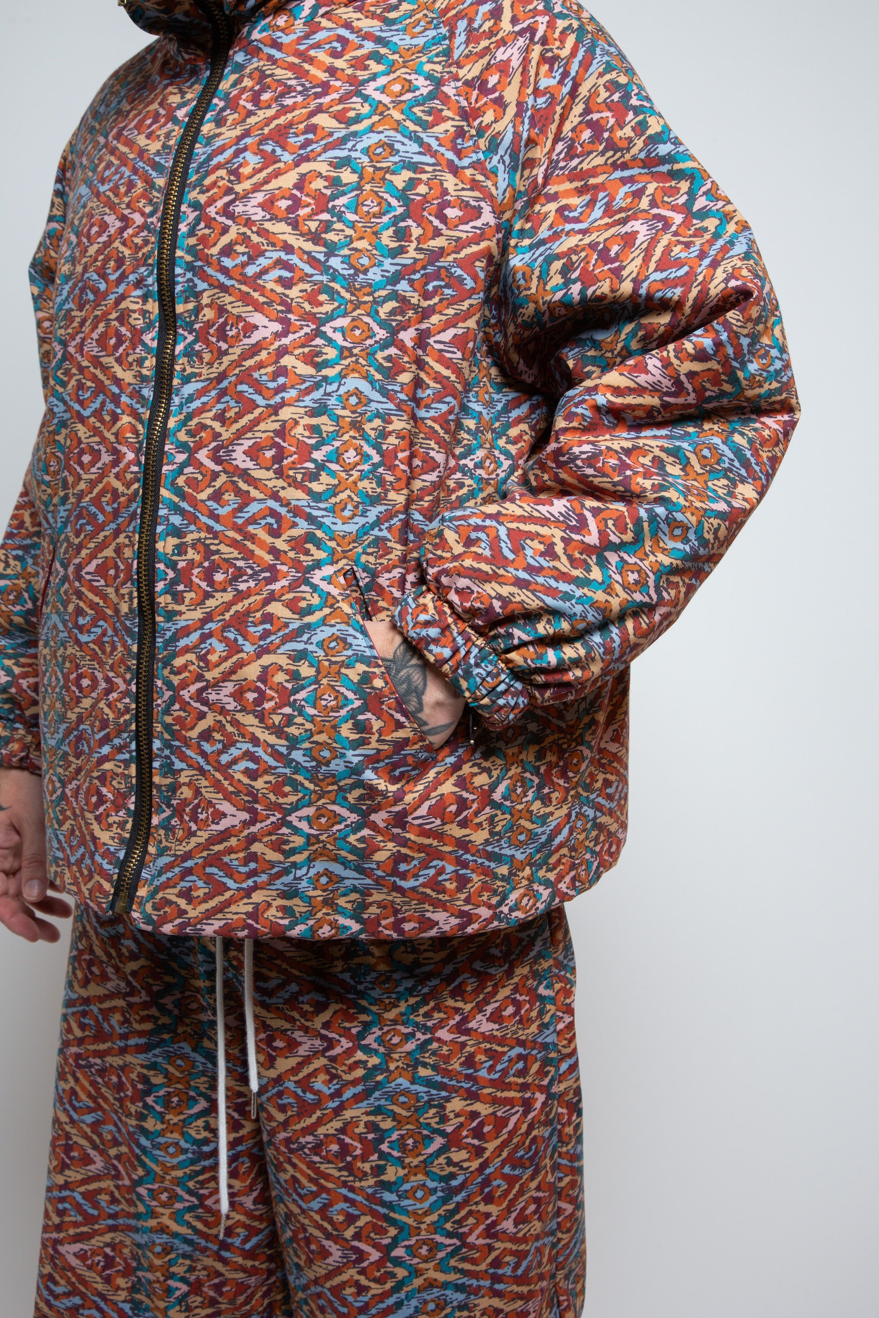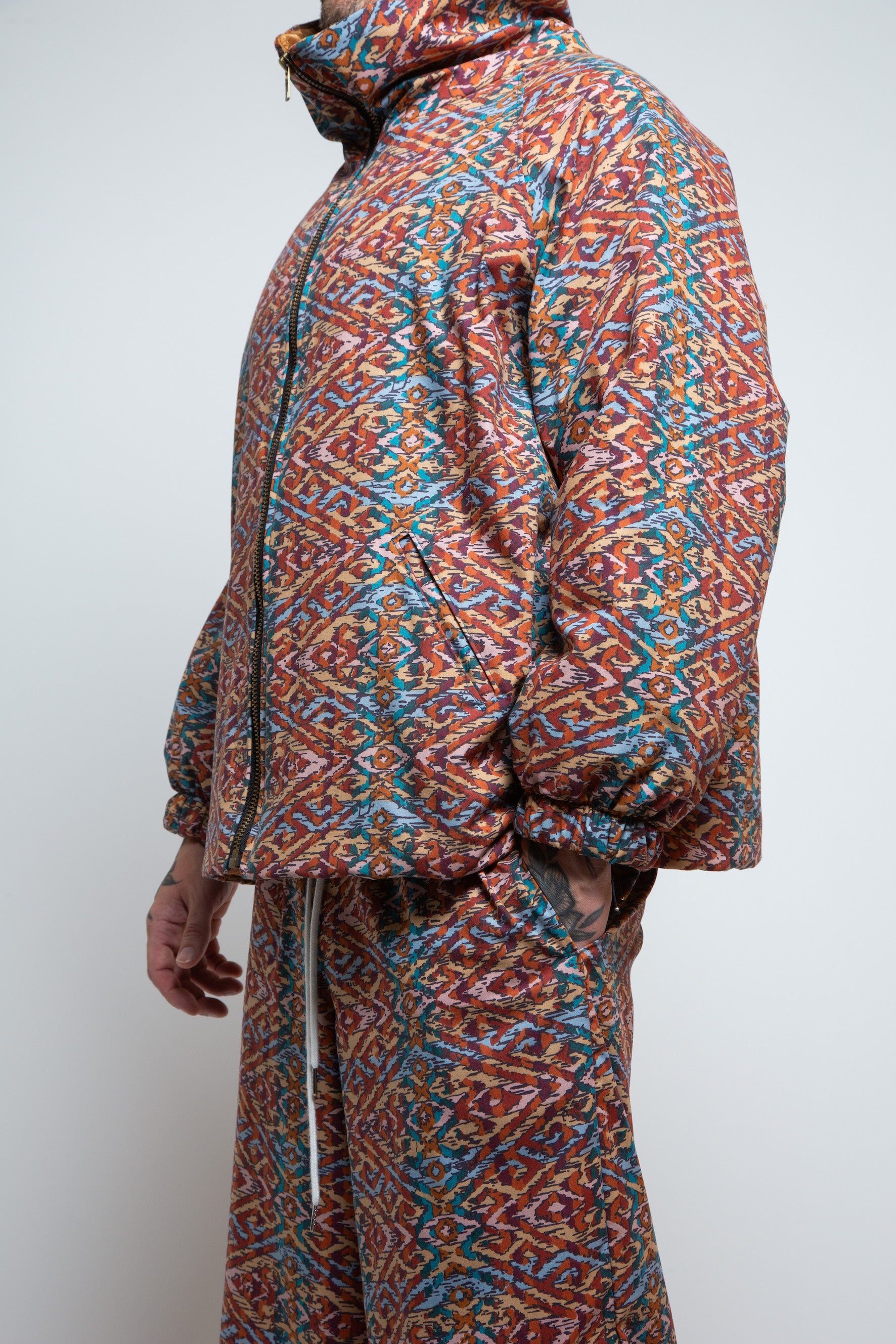 A colourful, digi-camou style print in a puffa jacket with side pockets, metal zip and super-high neck feature.