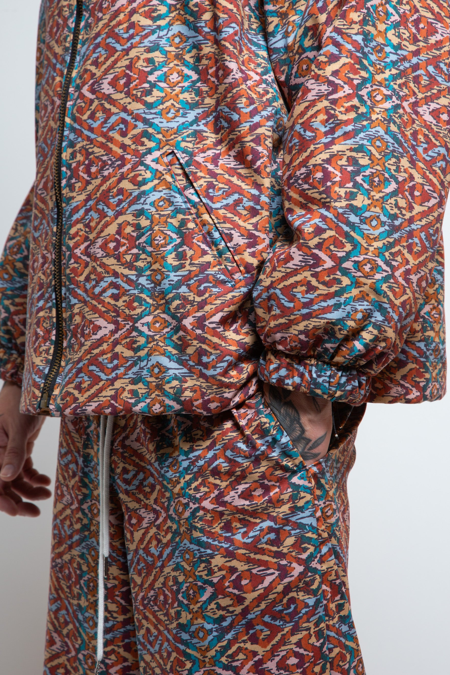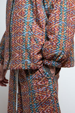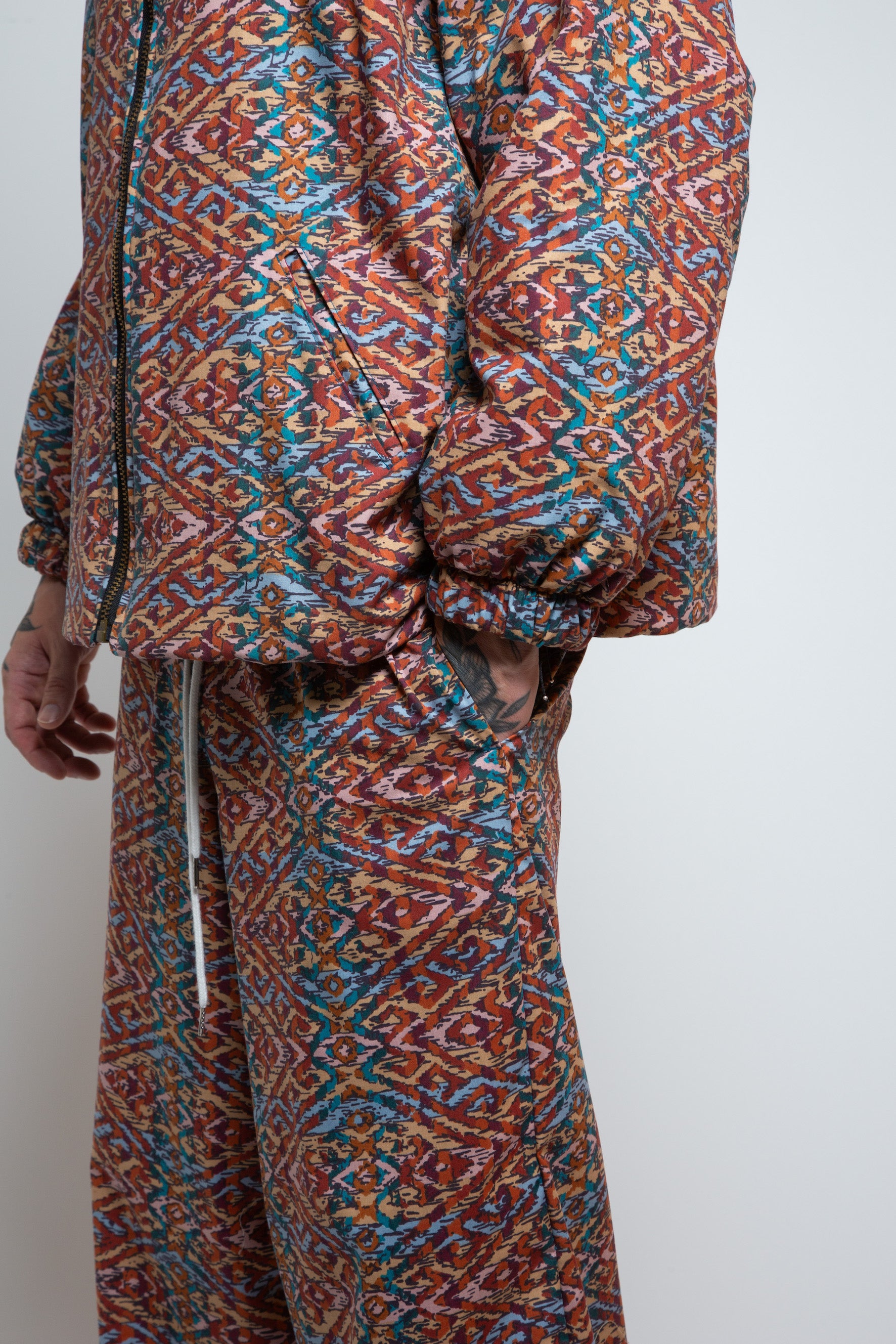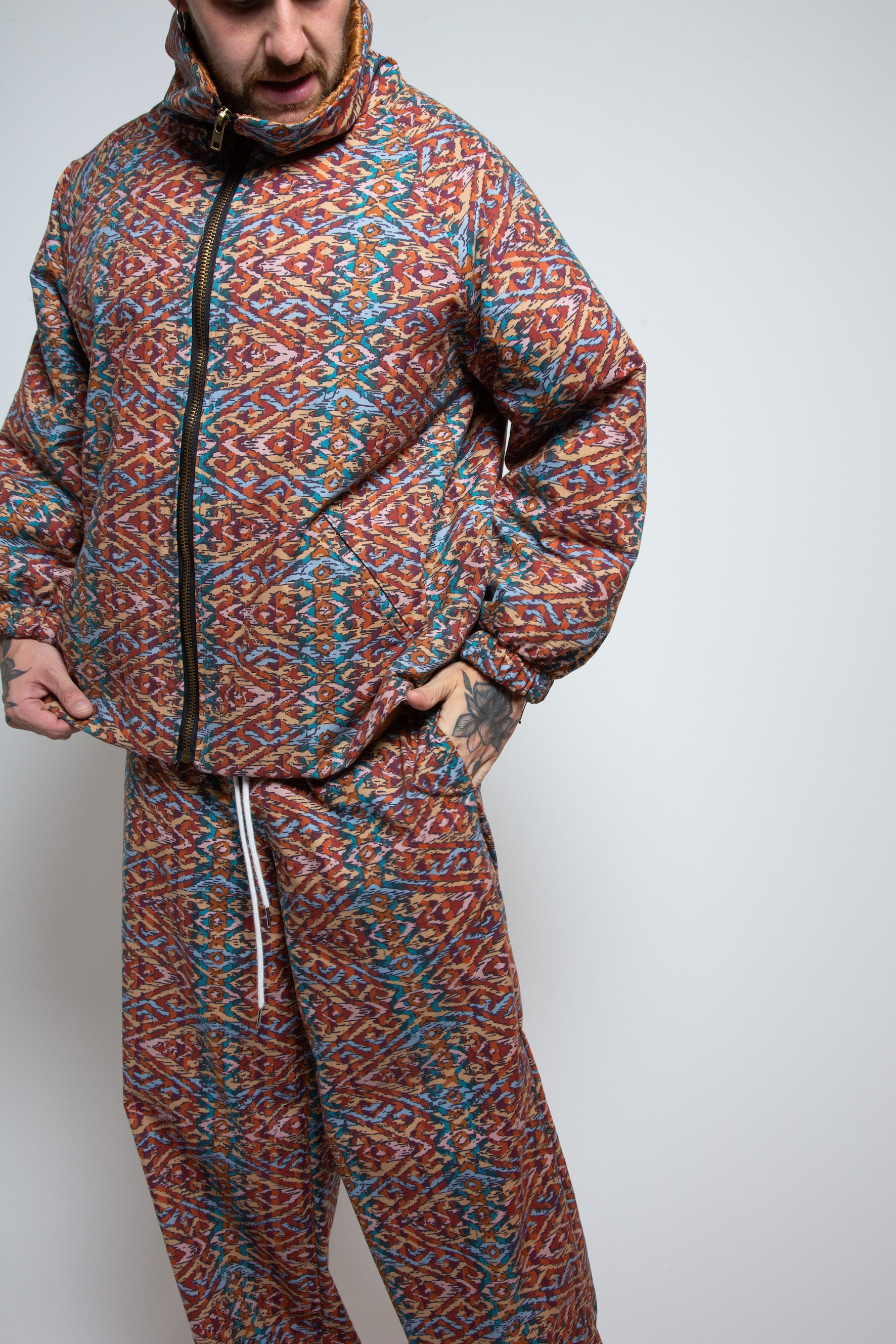 Statement print trousers handmade from upcycled 80’s deadstock cotton! This is a chine cotton with a waxy, shiny finish.